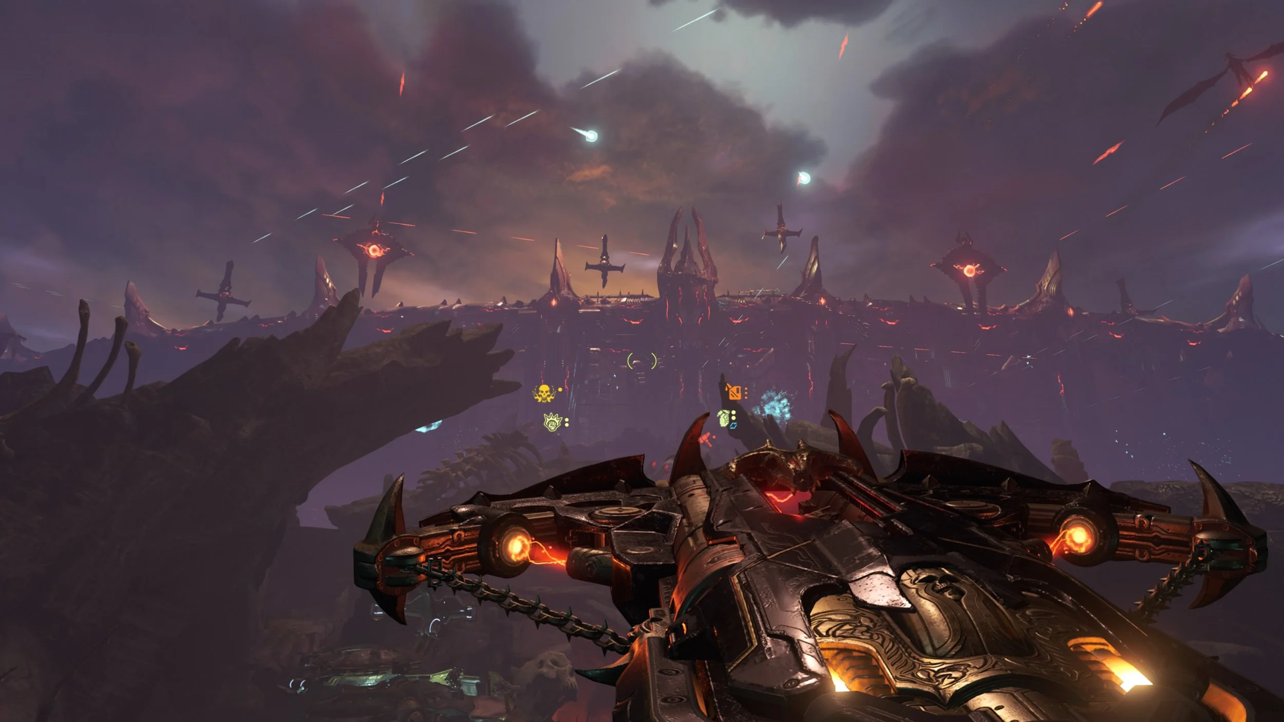 Then there’s the final full level of the DLC, Immora. This level is even shorter than Reclaimed Earth and honestly I don’t mind it. The setting and situation permits a small level, Basically, after you wake up the Dark Lord (the Devil), you have to go fight him in this specific location, his city of Immora, which is like the Washington D.C. of Hell. Compared to the fire and brimstone, rocks and runs, lava and spires of almost every other Hell environment in DOOM, this one is unique. It’s like a super advanced space city, a demonic Coruscant. And you land here in the middle of a full scale invasion. Yes, that’s right, you’ve got backup. Major backup. An army of Sentinels with Atlans (mechs) and space ships coming flying in like it’s the end of a Star Wars movie. This is cool, but again, like many things in the second half Doom Eternal onward, you don’t quite understand who these people are or what they want. There is some strong history suggested between the Doom Slayer and the Sentinels, but the problem is it just feels strange that they would just pop up now. It’s convenient and it works, it’s just a little odd.