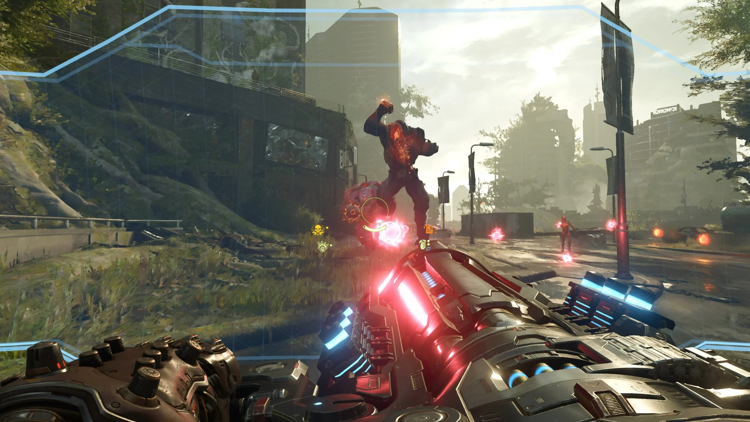 The level itself flows smoothly and is pretty cinematic. You go from the rocky outskirts of the battle, fire yourself from a crossbow through the walls, and then from there you fight your way to the heart of the city, dispatching of demons and Immora soldiers on the way. The Immora soldiers are cool looking but very easy to kill. It does, however, answer the question of “What would the Doom Slayer do against human combatants?” Answer: He basically vaporizes them. One punch and they shatter into bits. It’s brutal but also kind of funny. These soldiers, stationed here for millennia to prepare for the Dark Lord’s return…get destroyed by a button press or a stray bullet.